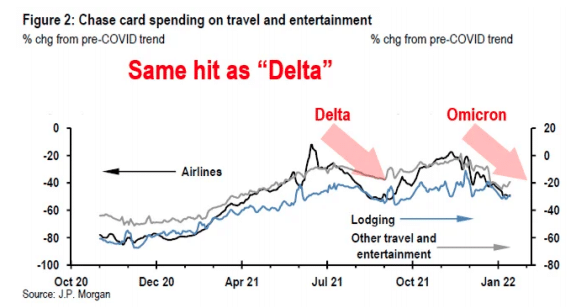 As Omicron fades across the U.S., the natural question would be whether we can expect a bounce in consumer spending or not. The chart from J.P. Morgan on Chase credit card data shows the impact on consumer spending due to Omicron was akin to the previous Delta variant: