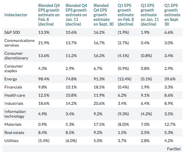 As shown in the table above, the blended EPS estimate for Q1 2019 continues to worsen and now represents a 1.9% decline from a drop of 0.9% last week. That’s a stark change from estimates for growth of 1.9% on Jan. 11 and of 6.7% on Sept. 30. Naturally, as Q1 2019 earnings estimates have proven to fall, the same has happened with respect to revenues. (See table below)