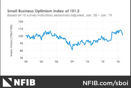 The NFIB Small Business Optimism Index slipped 3.2 points in January, as owners continued hiring and investing, but expressed rising concern about future economic growth. The 101.2 reading, the lowest since the weeks leading up to the 2016 elections, remains well above the historical average of 98, but indicates uncertainty among small business owners due to the 35-day government shutdown and financial market instability. The NFIB Uncertainty Index rose seven points to 86, the fifth highest reading in the survey’s 45-year history.