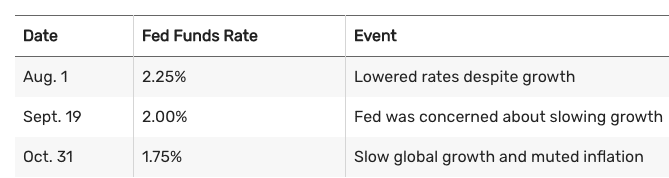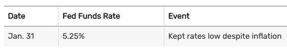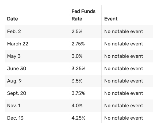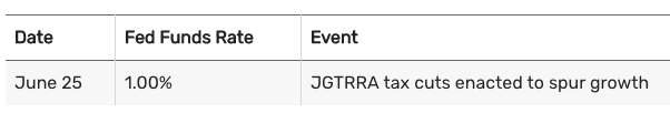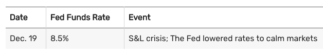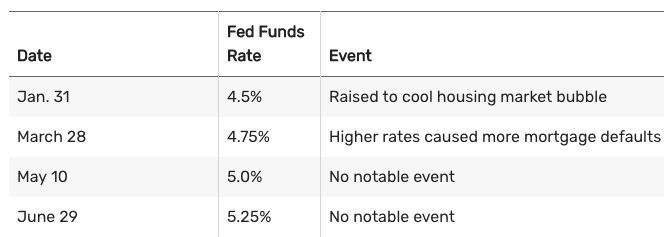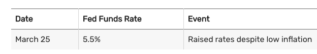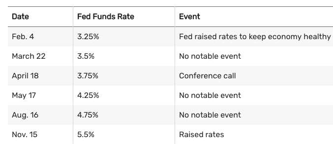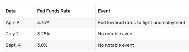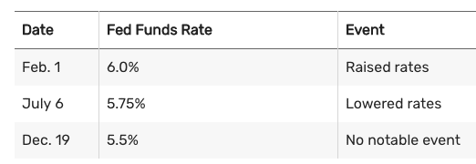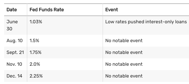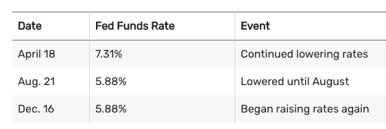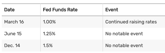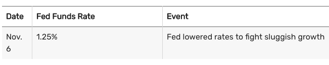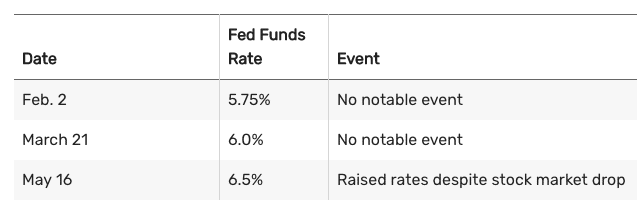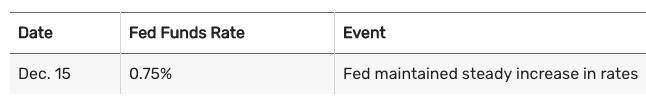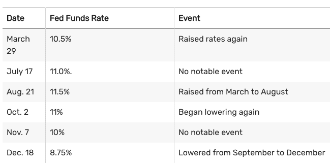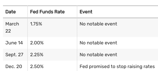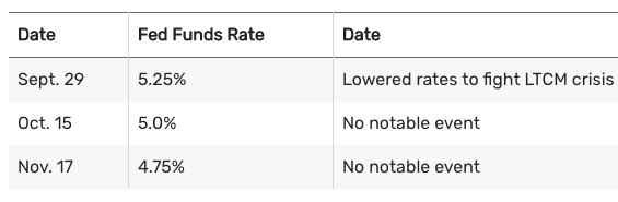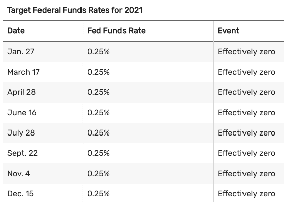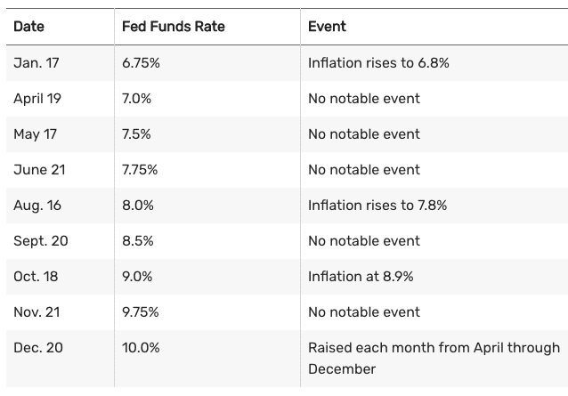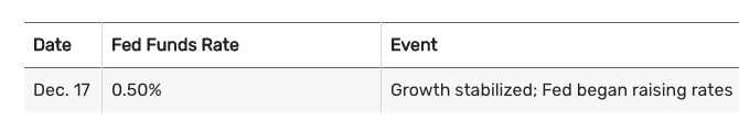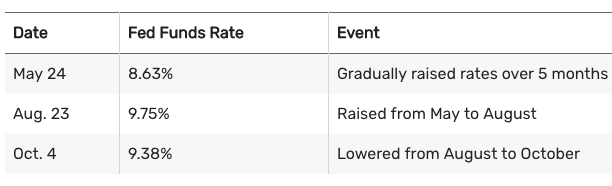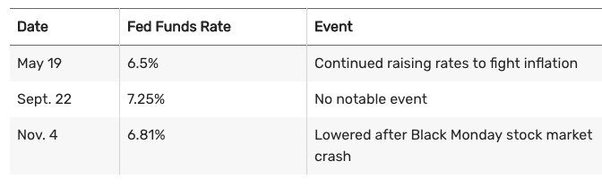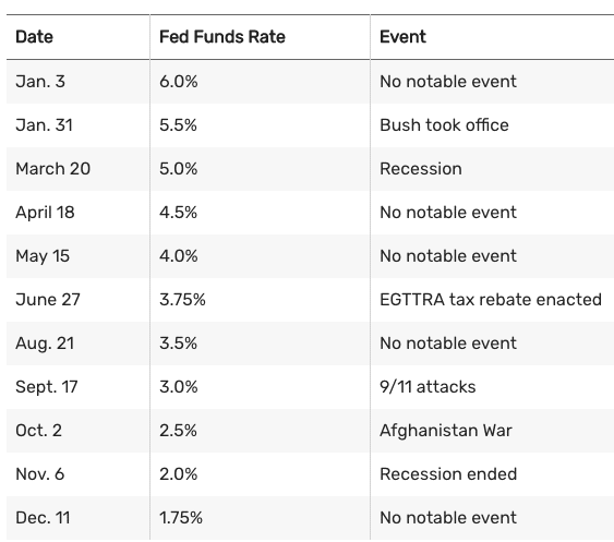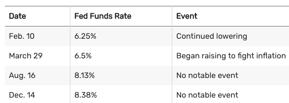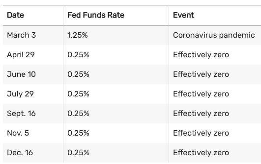 These are the target fed funds rates, along with the events that triggered the changes in cases where they did so. The Fed typically announces a range for its benchmark rate. The tables below show the high end of the range, while the low end is a quarter-point lower.