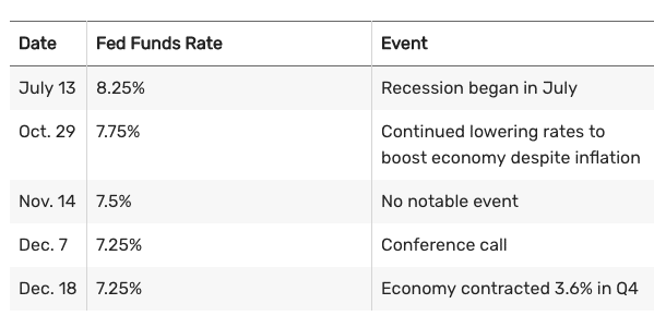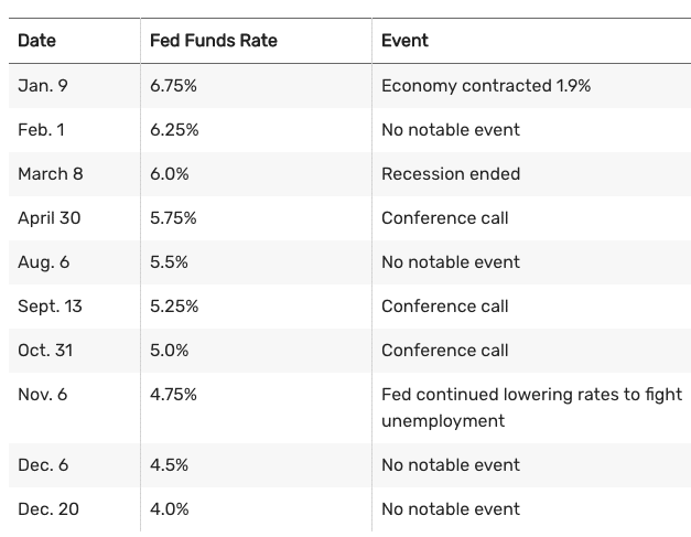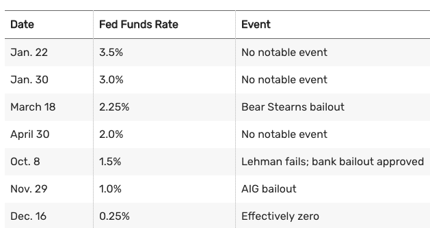 In 2008, The GDP was 0.1%, unemployment was 7.3%, and inflation was 3.8%. As of Dec. 16, 2008, the target funds rate became a range, represented in the tables by the upper limit.