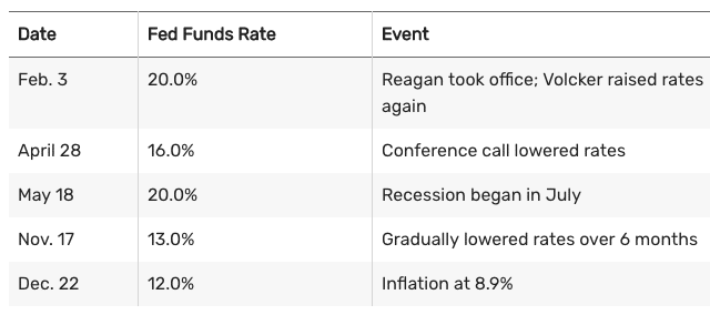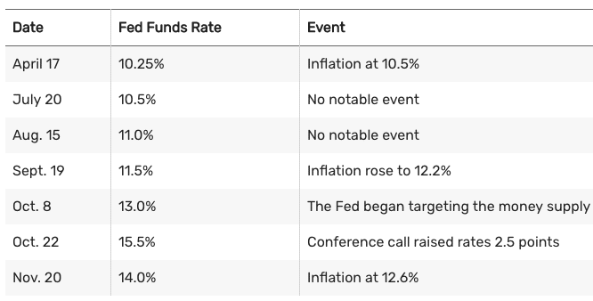 The charts below show the targeted fed funds rate changes since 1971. The Federal Open Market Committee (FOMC) didn’t announce its target interest rate after meetings until October 1979. The Fed adjusted the rate through its open market operations. Banks were forced to guess what the rates would be as a result. The Fed tried to fight inflation without managing the expectations of inflation.