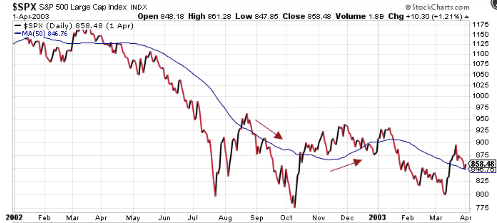 - A key difference with respect to the 50-DMA analysis and the 2002 price performance is that in 2002, while the index did test price levels above the 50-DMA, at no point did 90% of stocks trade above their 50-DMA.