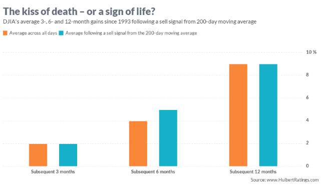 While many assume that breaching the 200-DMA creates a broad-based sell signal, history suggests something quite different. Take a look at the graphic below from Mark Hulbert that indicates the performance of the Dow, over the last 25 years, when it breaches the 200-DMA.