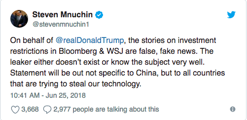 China stocks tumbled overnight on the report and European equity markets followed suit, which forced U.S. investors into a risk-off trade Monday. Later Monday morning, however, Treasury Secretary Steven Mnuchin added a little more color to the Wall Street Journal story with a tweet. Mnuchin called the Journal’s story “fake news” in a tweet. He also said, however, that the measure will impact not just China, but all countries.