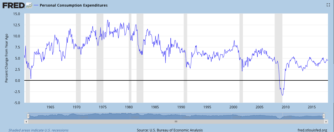 The Fed has hiked rates, now, 5 times since 2015 and is on a path to hike rates 3 times in 2018. The Fed’s most closely watched indicator of inflation is Personal Consumption & Expenditures, which is presently below the Fed’s 2% target mandate, but elevating year-over-year. One thing that we can clearly discern from the historic data on the PCE is that there have always been offsetting measures for inflationary concerns in the economy. See U.S. Bureau of Economic Analysis historic charting of PCE below: