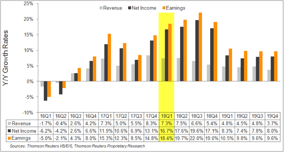 With the geopolitical and macro factors in our rear-view mirror, we now focus on earnings. First-quarter earnings season gets under way in earnest on Thursday and Friday, with results from large banks including BlackRock Inc. Wells Fargo & Co. and JPMorgan Chase. Expectations for a strong earnings season have been the focus of long-term investors. Investors have not been presented with such a quantitative earnings outlook in quite some time, as tax reform legislation serves to improve the quantity of earnings for the S&P 500 in 2018. The forecast for S&P 500 corporate earnings is presented below and by Thomson Reuters/Lipper Alpha Insights.