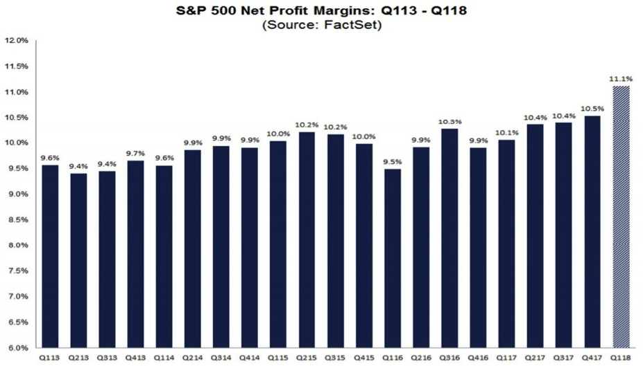 It’s relevant to define the current economic cycle as one that comes with higher corporate earnings, rising rages (finally), rising rates and borrowing costs, but also higher net profit margins. As Finom Group discussed in its latest research report this weekend, U.S. corporations are experiencing their highest net profit margins since 2013. As one can see in the chart below, the 11.1% blended net margins in Q1 2018 are at their highest level since FactSet began calculating margins in Q3 2008. Moreover, the chart also identifies that net profit margins were grinding higher even before the implementation of tax reform suggesting that Q1 2018 would have been a record for profits even without the tax cuts.