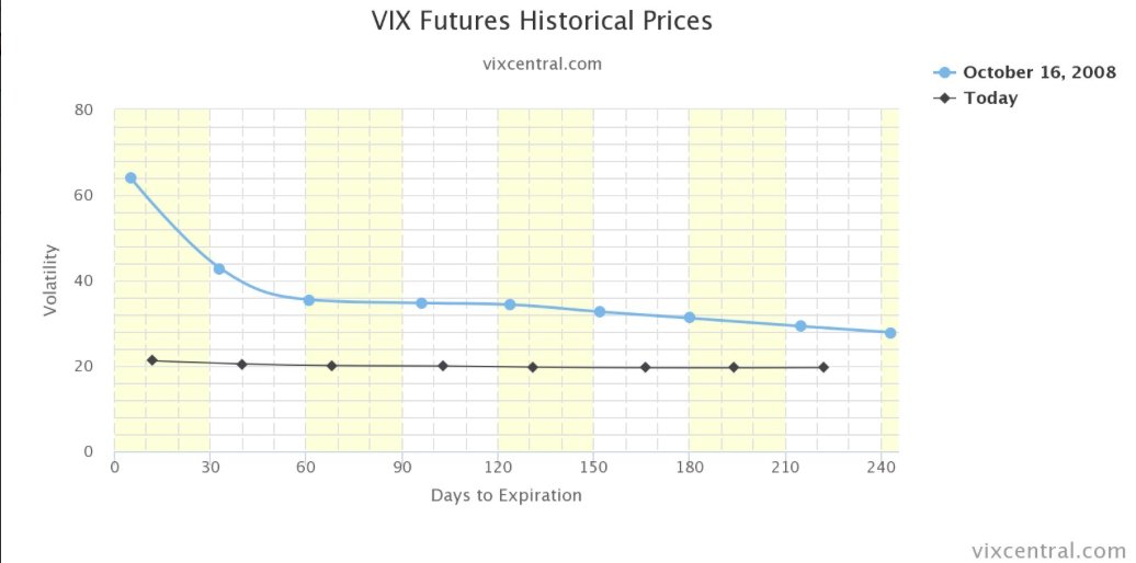 Presently, SKEW is reading 116, which is extremely low and even more so when juxtaposed to a market that is within a 10%, ongoing correction since October. This basically tells us that investors do not believe, presently, that there is some underlying systemic risk in the economic and financial systems. Now, let’s look at what VIX Futures Term Structure is telling us about how investors are pricing risk and whether or not they see system risk ahead for the market.