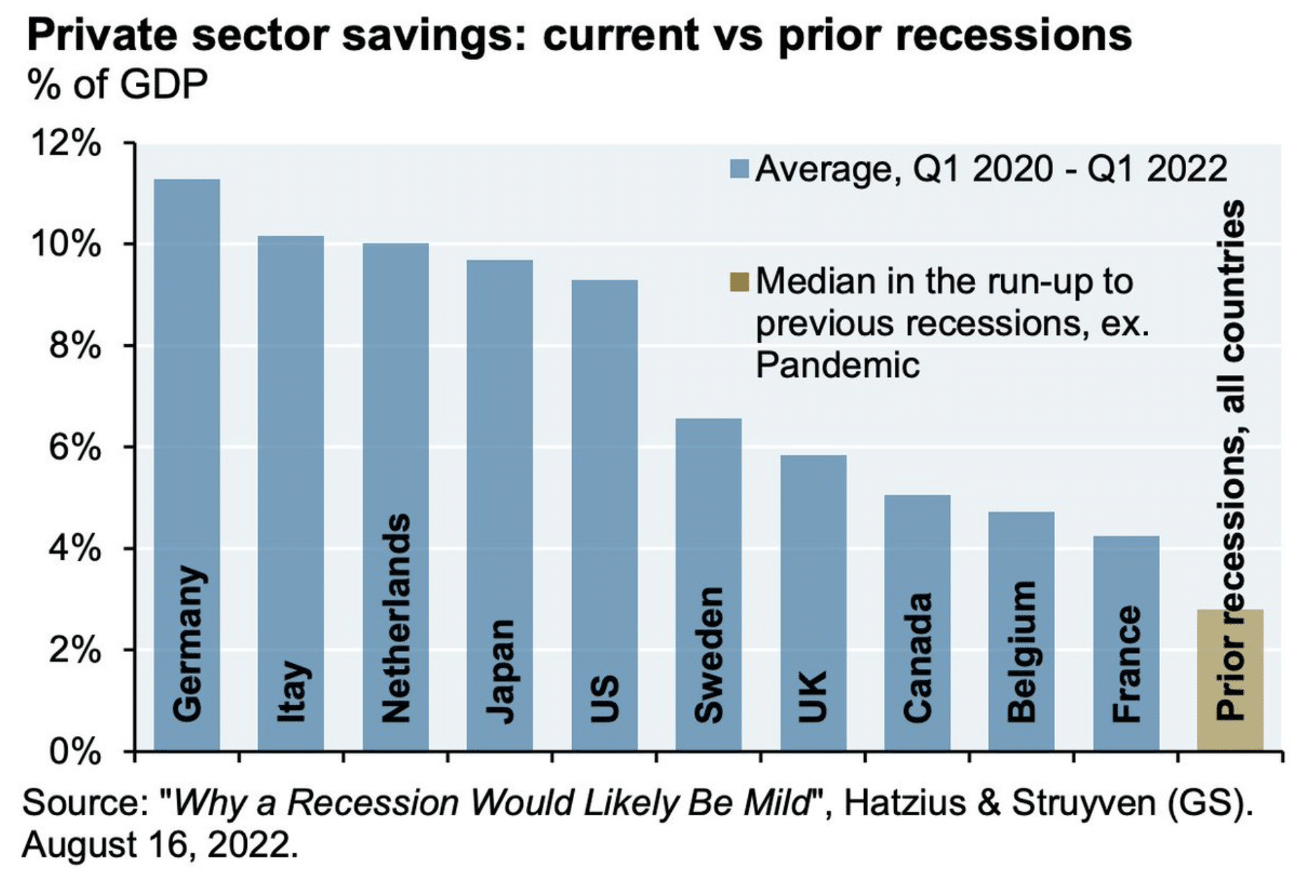Corporate and private household sector balance sheets remain robust, and with excess savings. The dynamics of the balance sheet strength favor a continuation of sales growth in 2023, but at a lesser pace, even as margins are forecast to contract. Excess Savings (not the Savings Rate) is unlike anything ever seen from past recessions, in U.S. and around the globe! Some countries have 4X and 5X Excess Savings prior to past recessionary periods(Goldman Sachs Chart).