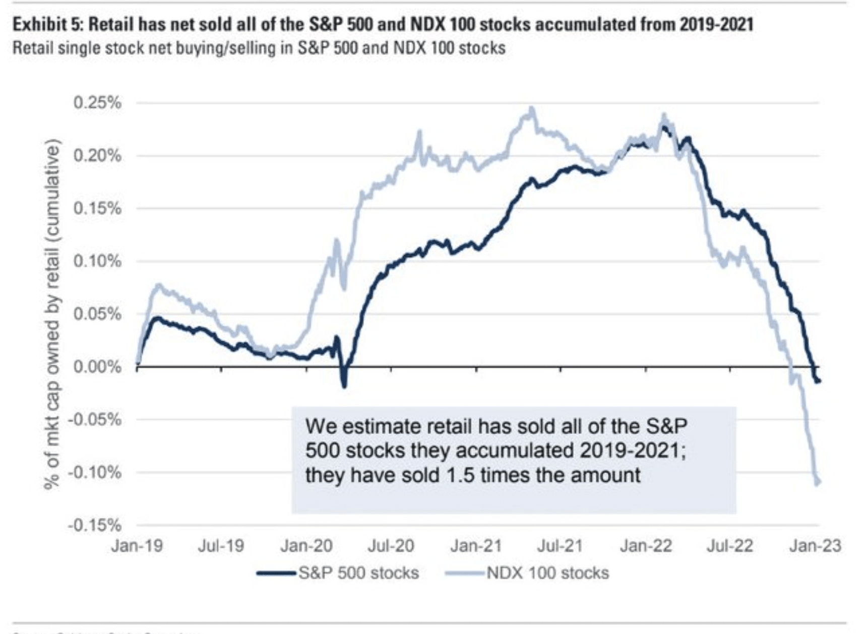 According to Goldman, U.S. retail investors/traders sold all of the stocks they accumulated during 2019~2021, and went further beyond to capitulate. That’s a meaningful determination by Goldman Sachs; capitulate! After all, they say that retail traders tend to buy the tops and sell the bottoms.