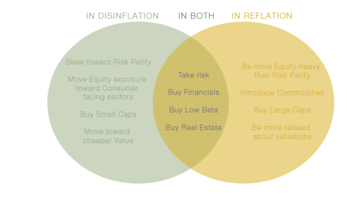 Take a look at the graphic and its headline categories for inflation regimes: Disinflation, Both, Reflation. In 2022, it was all about Reflation, where commodities and Large Cap Value outperformed. Late 2022 into early 2023 most investors are more comfortably aligning with the idea of a disinflationary regime. To the left, we can see that Disinflation regimes favor Consumer facing sectors and Small Cap stocks.