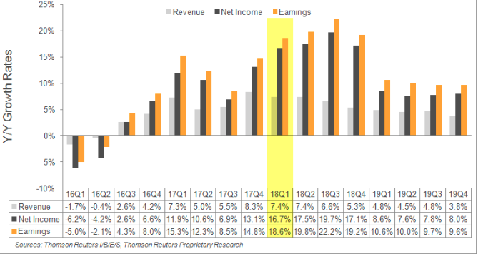 As we trend deeper into earnings season, we have to recognize the latest uptick in the forecast for Q1 2018 S&P 500 earnings. Last week, according to Thomson Reuters, Q1 2018 earnings were expected to grow 18.4% when compared to the same period a year ago. This was articulated in Finom Group’s latest research reported titled Geopolitical Concerns Weigh Heavily Against Earnings Season. But after the most recent outperformances from bank earnings, Thomson Reuters has revised its Q1 2018 earnings forecast higher.