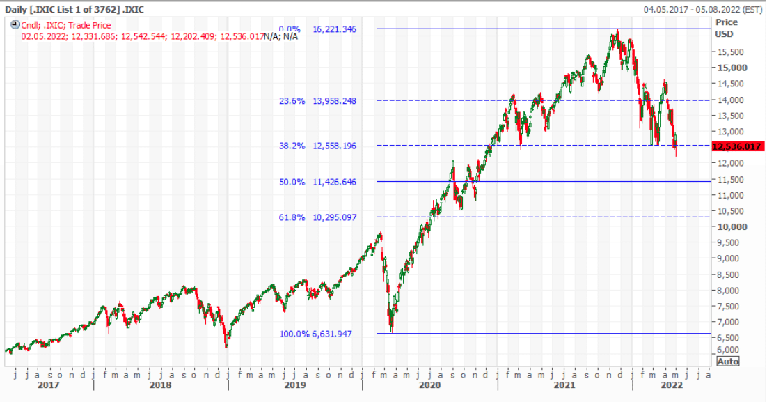 Market price behavior often proves the theory of market symmetry, and as such we can see this symmetry played out by the plotting of Fibonacci levels in the chart above. In 2022, the Nasdaq had tested support at the 38.2% Fibonacci level 3 times before breaking below recently. This does not automatically suggest doom and gloom, but it does reference the anticipation of further downside. The next Fibonacci retracement level would come at 50% or 11,426.