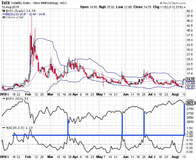 While the VIX rose sharply over the last 2 trading sessions as the S&P 500 dropped, opportunity may be at-hand. With Monday’s VIX spike, it is now above its 2 standard deviations Bollinger Band. This suggests that the stock market’s short-term downside is limited. Of course this is based on historic precedence as indicated in the chart below.