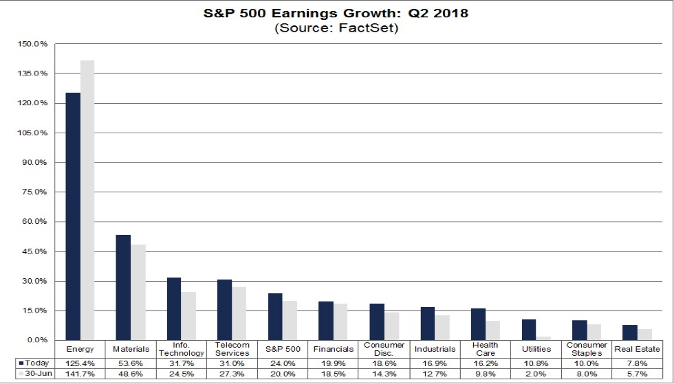 While the positioned chart within Morgan Stanley’s notes is undeniable, the analysis and conclusions being drawn bear greater burden of proof. The breadth vs. price divergence has occurred at various points over the last several years with regards to the Nasdaq and more recently in March of 2018. But the present divergence is seemingly elongated; lending itself to rising concern suggests Morgan Stanley. When we consider the tech-heavy Nasdaq, momentum names in the index and recently reported tech earnings we have to also consider the go-forward probabilities. Individual stocks and even indexes or sectors can express weakness in favor of future appreciation that is founded upon earnings. What we learned from tech earnings in the Q2 period is that they continue to come in quite strong.