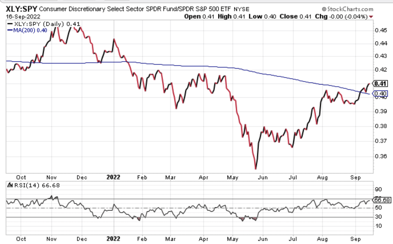 While the breakout held this past week, and moved slightly higher, I’ve added the 200-DMA. The XLY:SPY performance ratio is uptrending and well above its 50-DMA or interim moving average which has curled upward, but the 200-DMA is still descending, even with the performance ratio above this key long-term moving average. So here is what the weight of the evidence suggests in our opinion: