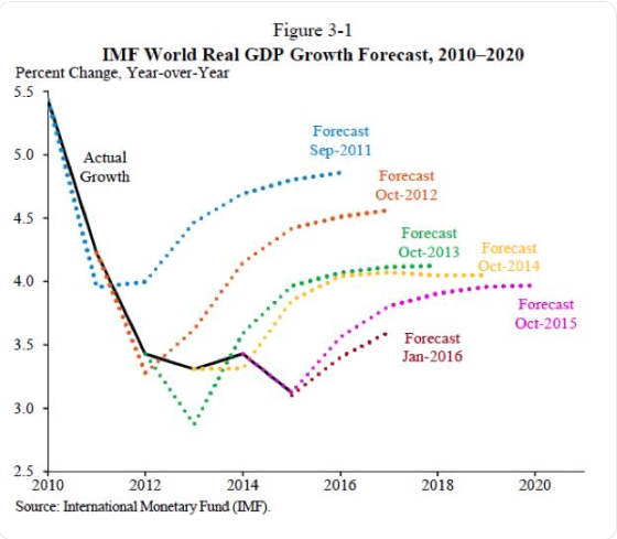 While most of the slowing growth is attributed to the downgrades throughout European nation states, the U.S. and China growth outlook remain unchanged. The IMF, in truth, has a terrible track record of forecasting global economic growth. The lender almost always issues a pragmatic outlook for the world economies. As shown in the chart below, the IMF is almost always proven wrong with its forecast.
