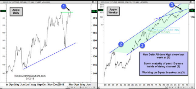 Even though the Dow Industrial Average was down triple digits on Monday, Apple Inc. shares managed to hit another all-time high. The consumer goods stock is edging ever closer to achieving a trillion dollar market cap. Shares of AAPL have been in a rising channel for many years now, according to Chris Kimble of the Kimble Charting Solutions blog. Kimble goes on to explain that AAPL’s recent surge has the stock attempting to break through six-year resistance. If that happens, he believes more buyers will pounce.