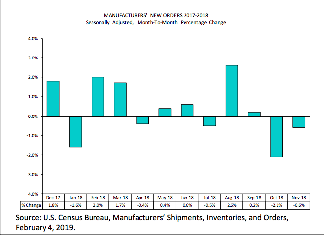 Factory orders in the U.S. fell more sharply than expected in November showing a slowdown in growth in the industrial segment of the economy toward the end of 2018. A key measure of business investment also declined. Orders dropped 0.6% in November. Economists polled by MarketWatch had forecast a 0.2% decline, largely because of lower oil prices. The report had been delayed by the 35-day partial government shutdown.