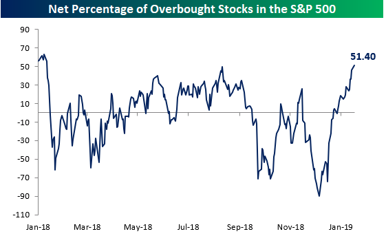 With the steady gains in the market lately, the percentage of stocks in the S&P 500 trading at overbought levels continues to trend higher. As of yesterday’s close, a net of 51.4% of the stocks in the S&P 500 are trading at overbought levels (>1 standard deviation above 50-DMA), and that’s the highest reading since late January 2018 when the percentage reached 63.4 percent.