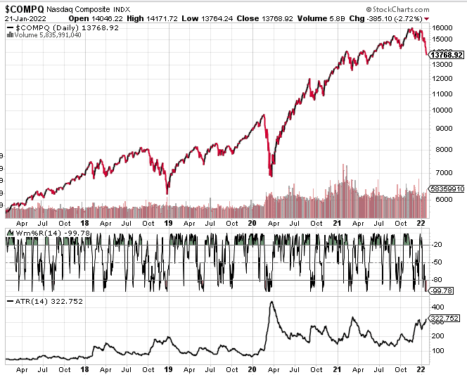 Williams %R, also known as the Williams Percent Range, is a type of momentum indicator that moves between 0 and -100 and measures overbought and oversold levels. How do we use the ATR and Williams %R in conjunction to deliver some kind of signal in a downtrend? Typically, when both indicators/metrics are hitting their extreme levels (ATR to the upside and Williams %R to the downside), a near-term bottom is afoot.