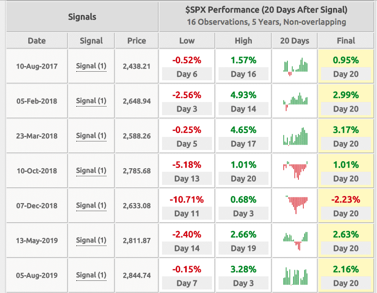 As shown in the study above, some of the lows didn’t actually materialize for another 2 trading weeks or so. Nonetheless, at the end of the 20-day period, the average final return was 2.15% and the positivity rate was 88 percent. While this study offers some positives going out roughly 1 month for the S&P 500…