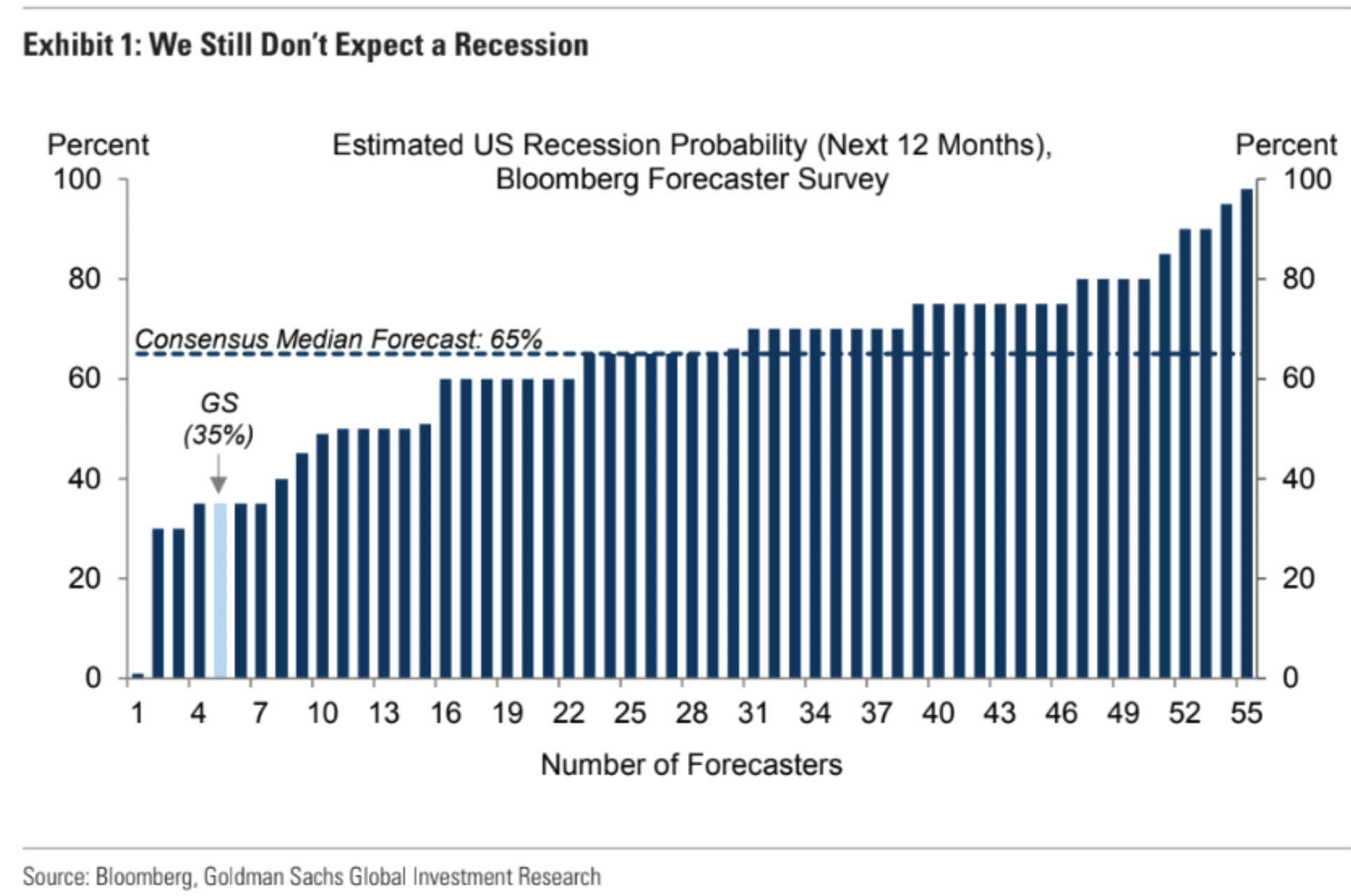 As one of the few Wall Street firms maintaining an outlook for a soft landing or no recession in 2023, Goldman Sachs offers the chart above, which still outlines the consensus median forecast of 65% probability of a recession. This is not to suggest Goldman Sachs or Finom Group, who shares a similar 2023 economic outlook, will be proven accurate in their outlooks for a resilient economy through 2023, but rather outlines where the crowd has found consensus.