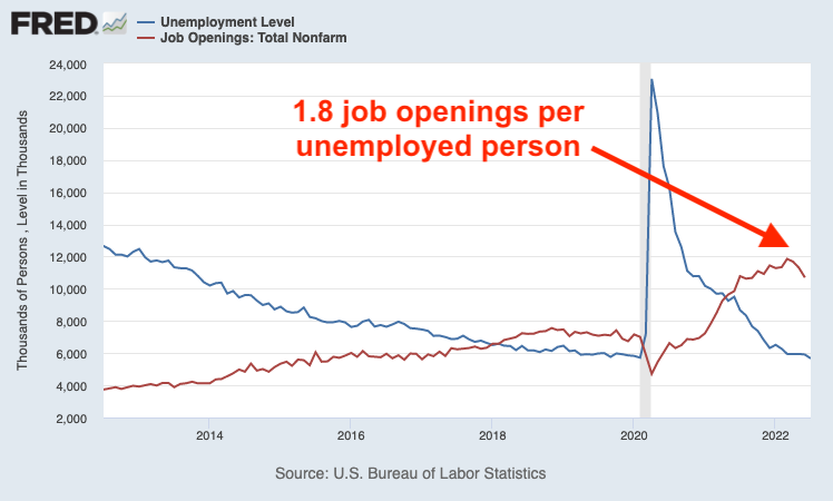 The number of job openings fell sharply in the latest JOLTS report/survey. However, there remain 1.8 job openings available for every unemployed person. These are definitely not recessionary conditions and it will prove very difficult to achieve a recession with these employment and labor market conditions.