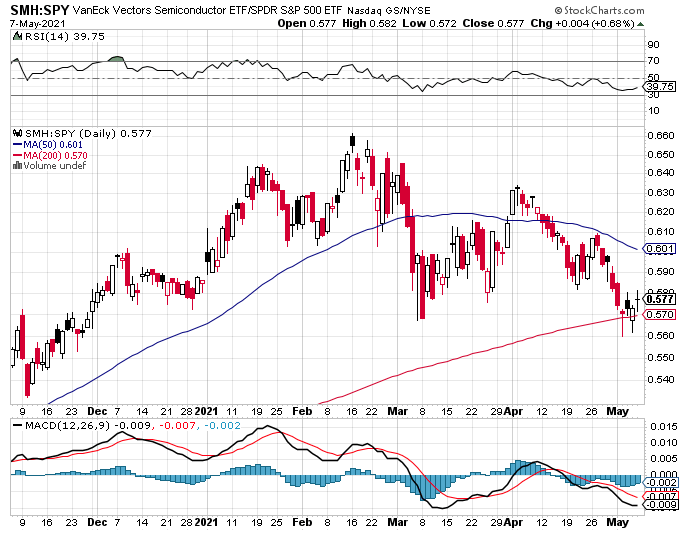 The chart above is yet another relative performance ratio chart. This time it is the semiconductor ETF (SMH) relative to the S&P 500 ETF (SPY). We touched on the chart during our weekly State of the Market video and as an update, the ratio ended the week just above it’s 200-DMA, with a minor improvement from Thursday. To emphasize thinking long-term, but acting on local price weakness, Finom Group believes this is another way to express such a belief by way of the largest technology component. While the chart suggests that semiconductors are likely to continue to underperform the S&P 500 near-term, the technicals only inform of the past and the developing situation. Anything can happen in the coming week to throw the chart off-track.