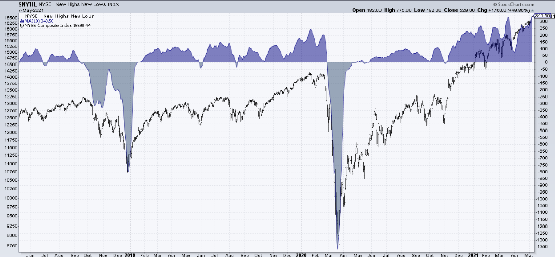 In Tony’s call for a 10% correction, over a couple of months on April 20, 2021, the strategist also lowered his market outlook from Overweight to Neutral. This, even with the breadth indicators noted above. Not to mention the expansion of New highs – New Lows in the NYSE, basically the highest it has been since… well I can’t remember when! The chart below is extremely potent.