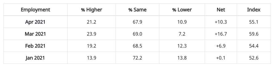 ISM’s Employment Index registered 55.1 percent in April, 4.5 percentage points lower than the March reading of 59.6 percent. “The Employment Index grew for the fifth month in a row. Of the six big manufacturing sectors, four (Fabricated Metal Products; Food, Beverage & Tobacco Products; Transportation Equipment; and Computer & Electronic Products) expanded. Continued strong new-order levels, low customer inventories and expanding backlogs indicate potential employment strength for the balance of the quarter. For the eighth straight month, survey panelists’ comments indicate that significantly more companies are hiring or attempting to hire than those looking to reduce head counts,” says Fiore.