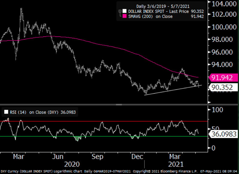 Buybacks generally prove another tailwind for earnings growth, beyond that of improving gross margins through deleveraging and streamlining of business operations. Least we forget the impact of a weaker dollar on earnings growth, which also provides a boost to the bottom line? The chart below shows the dollar has broken the 2021 uptrend line as of this past week, to the downside!