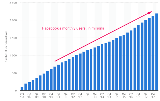 You’re going to hear a great deal about the tech sector going forward and especially since it is so dramatically outperforming the Dow Industrial Average. Terms like dotcom, bubble and bubblicisiousness will be thrown around by the permabears to describe the divergence and dramatic outperformance of the Nasdaq when compared to the Dow. While it’s the job of the permabears to %^#!, whine and complain about tech sectors surge to all-time highs and some of the incredible price-to-earnings multiples, that’s the way it’s supposed to be. The bottom line is that the current composition of the tech sector is nothing like that from the dotcom bubble. The earnings are real for today’s technology titans that contribute to the Nasdaq’s outperformance. The sales are that much more relevant. Companies like Facebook, Netflix, Amazon and Alphabet dominate our world and continue to see magnificent growth rates. Look at the chart of Facebook’s ever-growing user base below that underlines its tremendous sales and earnings growth.