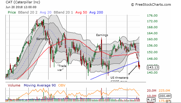 While headwinds remain ever present in the market, we’ll have to see how the trading session goes. Finom Group remains risk neutral, trading the day-to-day action while maintaining a long-term outlook centered on a growing economy, growing corporate earnings and sales as well as limited inflation. Unfortunately, the Dow is more heavily littered with equities that have leverage to global trade, which is seemingly casting a shadow over today’s market activity. Caterpillar and Boeing are two such Dow stocks currently preventing the index from moving higher and contributing to what may turn out to be another losing trading session. Caterpillar (CAT) gapped down below its 200DMA and confirmed the breakdown with yesterday’s loss. CAT last traded below its 200-DMA over two years ago.