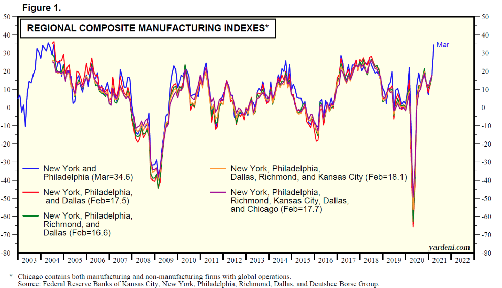 (1) Regional and national business surveys. Their average tends to be a good leading indicator for the average of the five surveys conducted by these two FRBs along with the ones in Richmond, Kansas City, and Dallas. The average of the five business activities indexes is highly correlated with the national M-PMI (Fig. 2). That means that the average of the New York and Philly indexes also is highly correlated with the national M-PMI and is signaling a solid number for the latter’s March reading (Fig. 3).