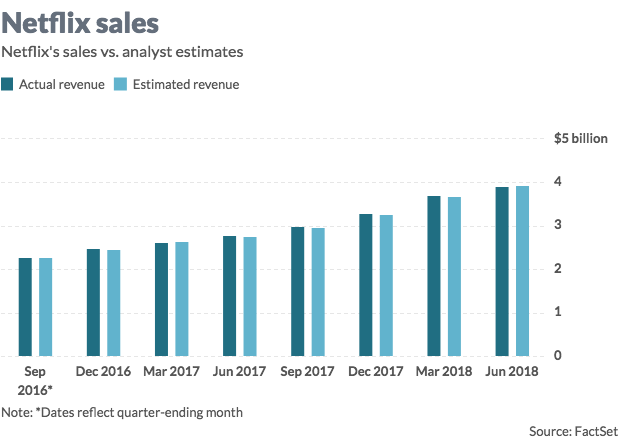 “We’ve seen this movie of Q2 shortfall before, about two years ago in 2016,” Hastings said at the time. In 2016’s second quarter, Netflix fell below subscriber growth expectations, but the company has mostly beat guidance since then.