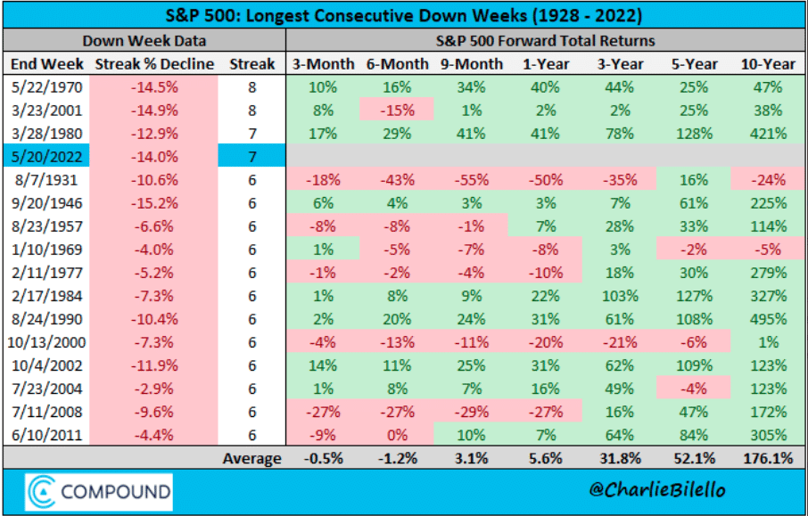 Recall that prior to May’s, 6%+ month-end rally, the S&P 500 was down 7 consecutive weeks. This was the longest weekly down streak since 2001, which fell 8 straight weeks (and was tied w/ 1970 for the record). Here’s a look at what happened following the longest down streaks in history.