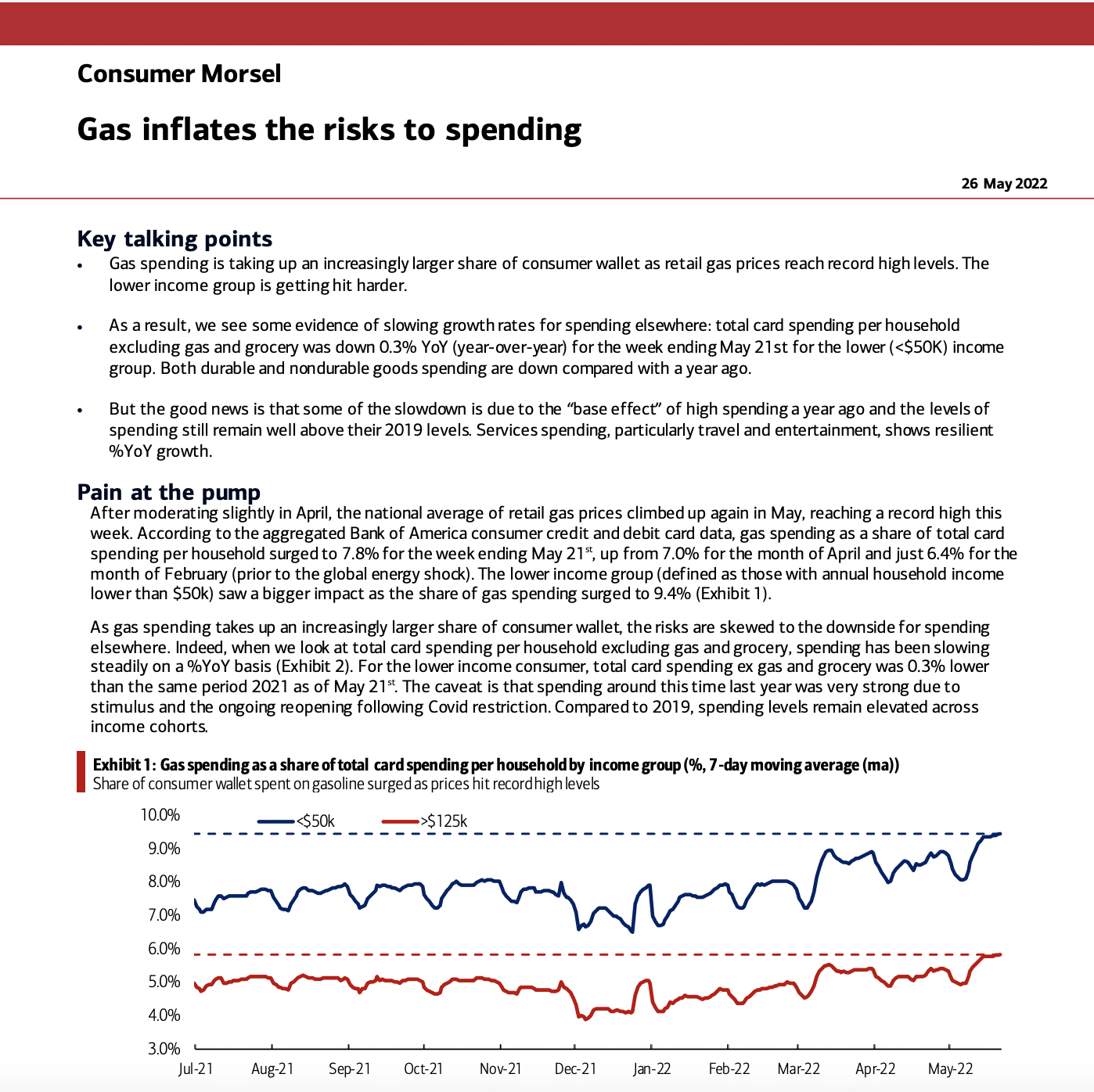 Bank of America Card spending data suggests it may already be showing up and since the end of the month of May, when gasoline prices averaged $4.50/gallon nationally.