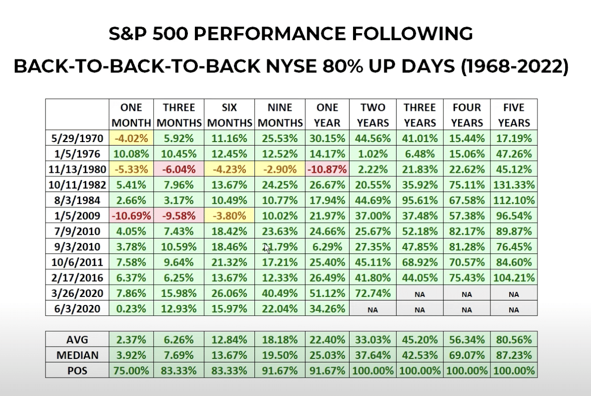 The following table, from Chris Ciovacco, recognizes the occurrences of BTBT days since 1970. And as we can see from the quantitative data’s results, forward looking returns still appear quite favorable.