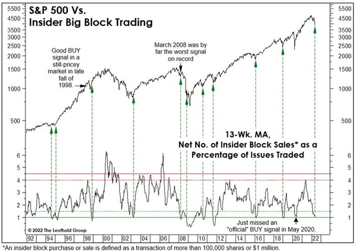 If the 13-week average of Net Insider block sales dips to 1.0 (which it has), it has signaled near/at market low since 1990. There has only been one false positive signal, in 2008. The average S&P 500 return 12-months forward since 1990, post the Insider Buying signal, has been 18.5 percent.