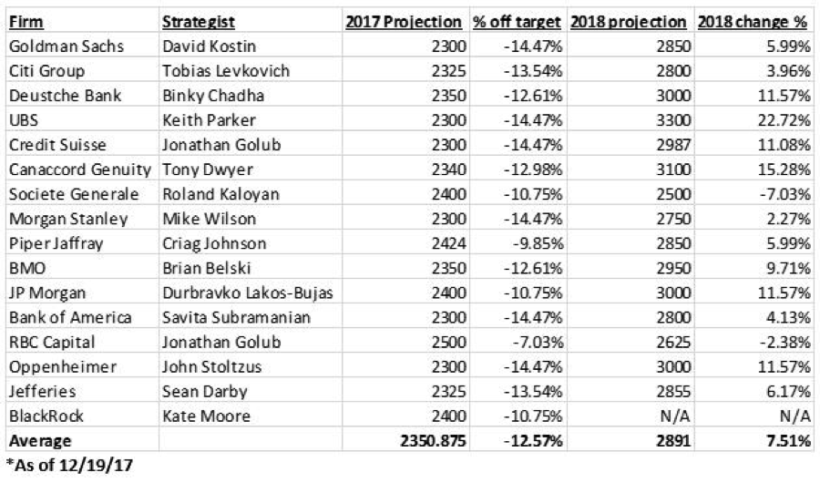 The following table identifies S&P 500 target levels by some of Wall Street’s largest financial and market institutions, as of late 2017.