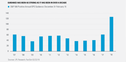 The raised corporate guidance through the Q4 2017 earnings period forced LPL to raise their 2018 S&P 500 target and earnings forecast in late February. According to LPL Chief Investment Strategist John Lynch, “We expect earnings to continue to get strong support from accelerating U.S. and global economic growth, a pickup in business spending, and strong manufacturing activity. Our revised year-end S&P 500 fair value range of 2950–3000 represents a 19.5 price-to-earnings ratio on $152.50 in earnings per share in 2018.”