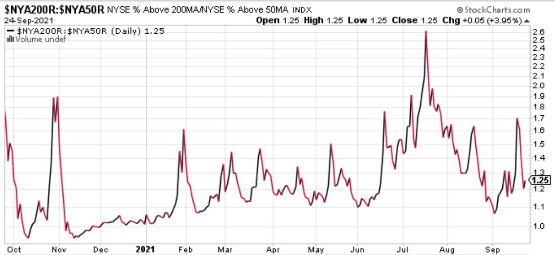 To better understand the overall interim directional trend, it may prove better to take a broad market approach by way of the NYSE % of stocks above their 200-DMA relative to the % of stocks above their 50-DMA. Remember, if the chart shows the trend line moving higher, the interim trend is weakening, and when the trend line is moving lower, the interim trend is strengthening.