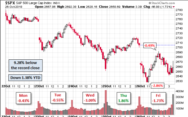 As depicted in the chart above, the S&P 500 experienced losses 4 out of 5 days this past week and neared a correction on Friday, closing 9.28% below the record close. Friday saw a loss of 1.73%. The index is down 3.9% from last week and now in negative territory for 2018 by nearly .5 percent.