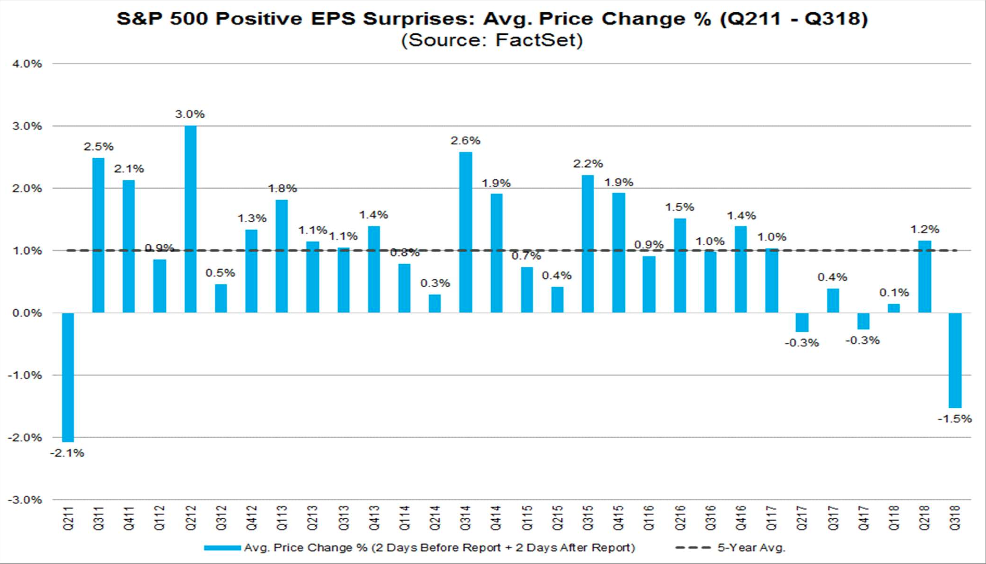 Why is the market punishing companies that have reported positive earnings surprises? It is likely NOT due to EPS guidance or analyst revisions to EPS estimates for the fourth quarter. To date, 63% (26 of 41) of the companies that have issued EPS guidance for Q4 have issued negative guidance. This percentage is below the 5-year average of 70%. In aggregate, analysts have made smaller cuts than average to fourth quarter EPS estimates during the month of October. The following chart from FactSet depicts the poor response to positive earnings.