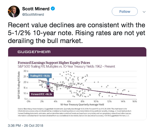 The Guggenheim CIO said climbing rates, as the Federal Reserve normalizes monetary policy, “are not yet derailing the bull market” that has run for about a decade. Minerd estimated that the selloff investors have suffered reflects a 10-year Treasury note yielding 5.5%, not the one that currently sits at 3.08%, around the lowest level for that debt since Oct. 2.
