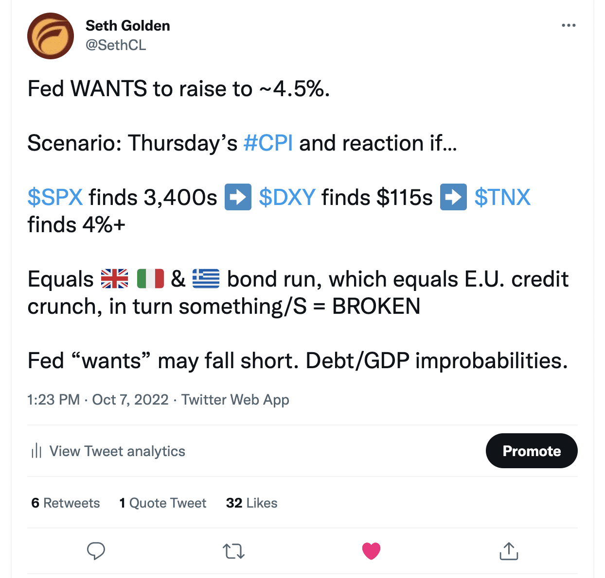 My tweet from Friday, time stamped even before Kyle Bass’ tweet, is rather short-hand for all I mentioned above. The scenario that I put into game theory was one that finds the CPI not falling, badly missing even the estimates to the upside, with even greater upside, and markets fall further. The safe-haven Dollar likely gets another very strong bid under this scenario, regenerating the U.K credit market issues that may reverberate in other highly indebted countries around the Eurozone such as Greece and Italy, which would become a growing issue for the Eurozone as a whole.