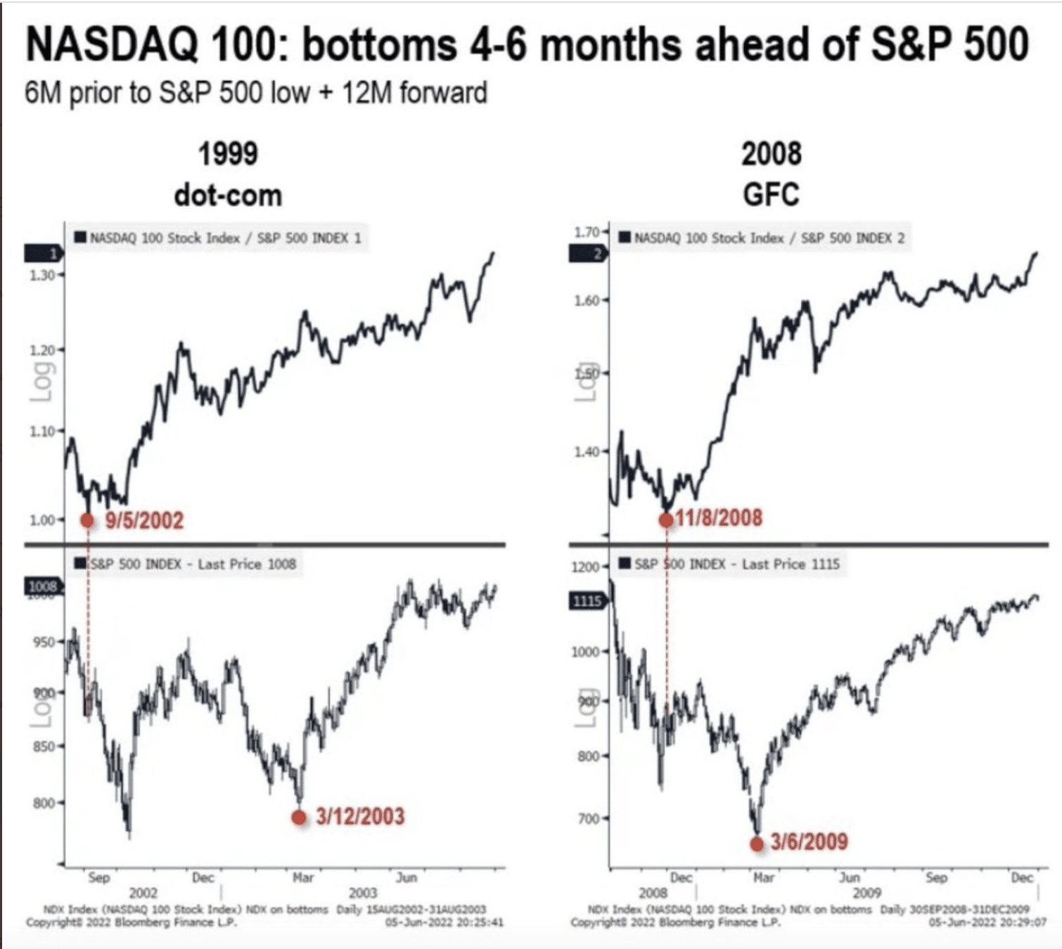 The 5-year chart of the performance ratio has been finding critical support at where it broke to the upside in April of 2020, just after the indices bottomed. It’s also important to remind ourselves that the performance ratio has been a leading indicator of a market bottoming process in the past. Historically, since 1999 Dotcom bubble, the NDX:SPX performance ratio bottomed 4-6 months ahead of the S&P 500’s bottom. The charts below demonstrate the technical analysis above: