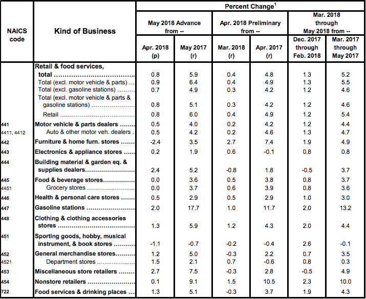 Retail sales jumped by 0.8% in May, twice as high as many economists had forecast. Sales growth in April and March were also revised up sharply, partly reflecting changes in how the government calculates the numbers. Retail sales in April, meanwhile, were raised to show a 0.4% gain from an initial 0.2% reading. Sales in March grew 0.7% instead of being unchanged. Retail sales have risen 5.9% over the past 12 months, the government said Thursday. Sales are rising at a more than 5% yearly pace even if gas is excluded. Below is the categorical breakdown of retail sales on a month-2-month and year-over-year basis.